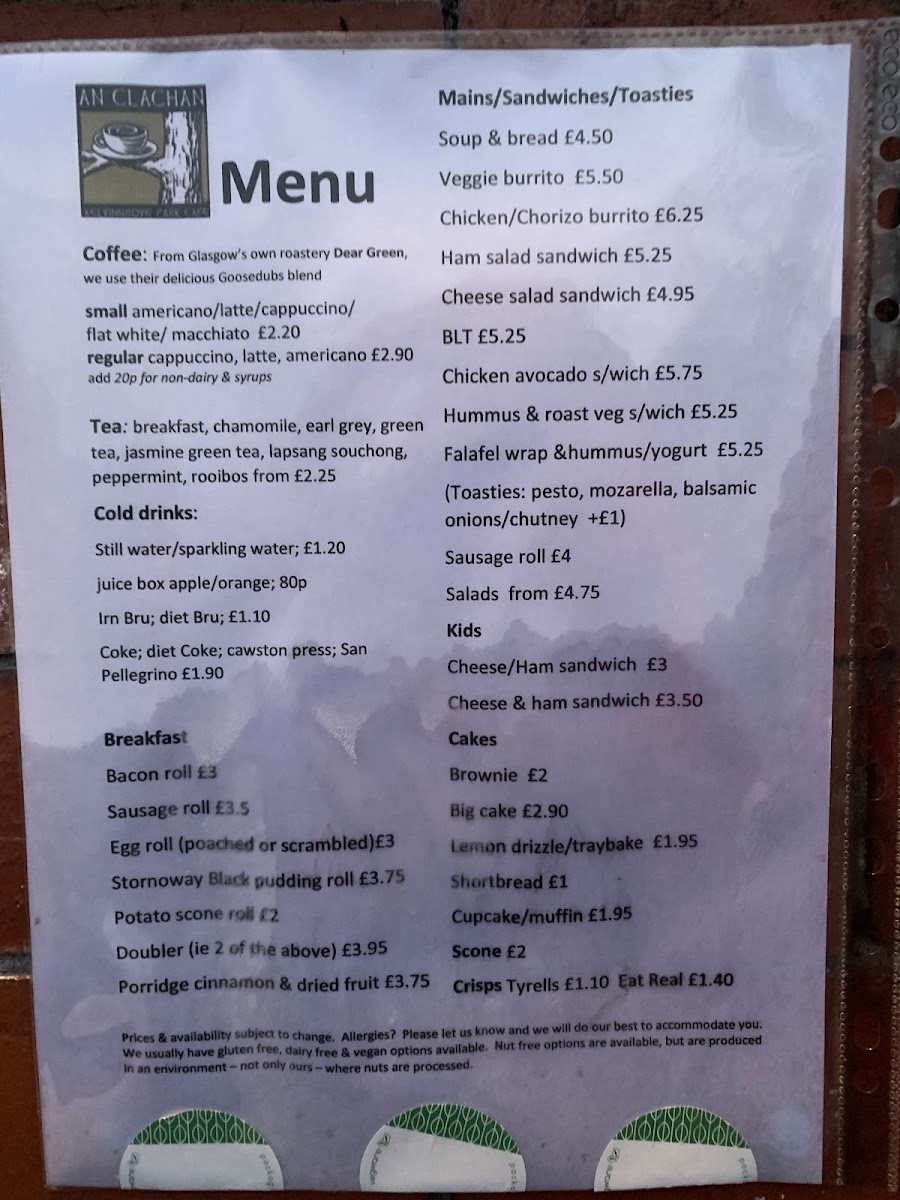 From a reviewer’s perspective, the menu at An Clachan Cafe offers a charming blend of classic café staples and comforting treats, all neatly organized for easy choice. Breakfast enthusiasts can enjoy hearty options like the Bacon Roll, Sausage Roll, Egg Roll, Stornoway Black Pudding Roll, and Potato Scone Roll, each promising a satisfying start to the day. For younger diners, the Cheese/Ham Sandwich and Cheese & Ham Sandwich provide simple yet reliable options. The café’s sweet selection is equally appealing, with Brownie, Big Cake, Lemon Drizzle/Traybake, Shortbread, and Cupcake offering indulgent bites that pair perfectly with the Loose Leaf Teas like Indian Spiced Chai and Earl Grey Leaf, or a freshly brewed coffee such as Small Americano, Regular Cappuccino, Latte, or Americano. Lighter or more filling meals include the Soup & Bread, Veggie Burrito, and Chicken/Chorizo Burrito, highlighting the café’s attention to both comfort and variety. Overall, the menu strikes a balance between classic Scottish breakfast items, kid-friendly sandwiches, indulgent cakes, and a modest selection of drinks and mains, making An Clachan Cafe a versatile spot for casual dining in the heart of Kelvingrove Park.